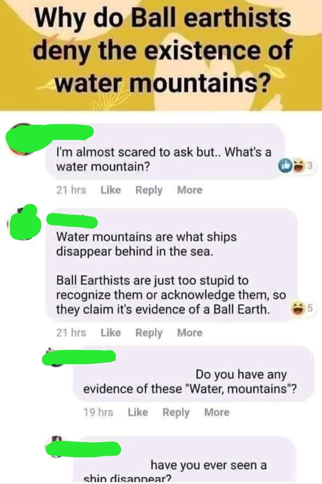 “the earth is flat since water is always level, oh except water mountains”