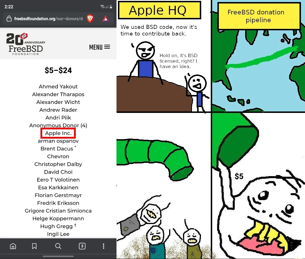 Igual Apple esposorea harto más que lo que sale ahí. He visto muchos videos de conferencias y exposiciones de FreeBSD donde aparece publicidad de Apple. Y dudo que eso sea gratuito.